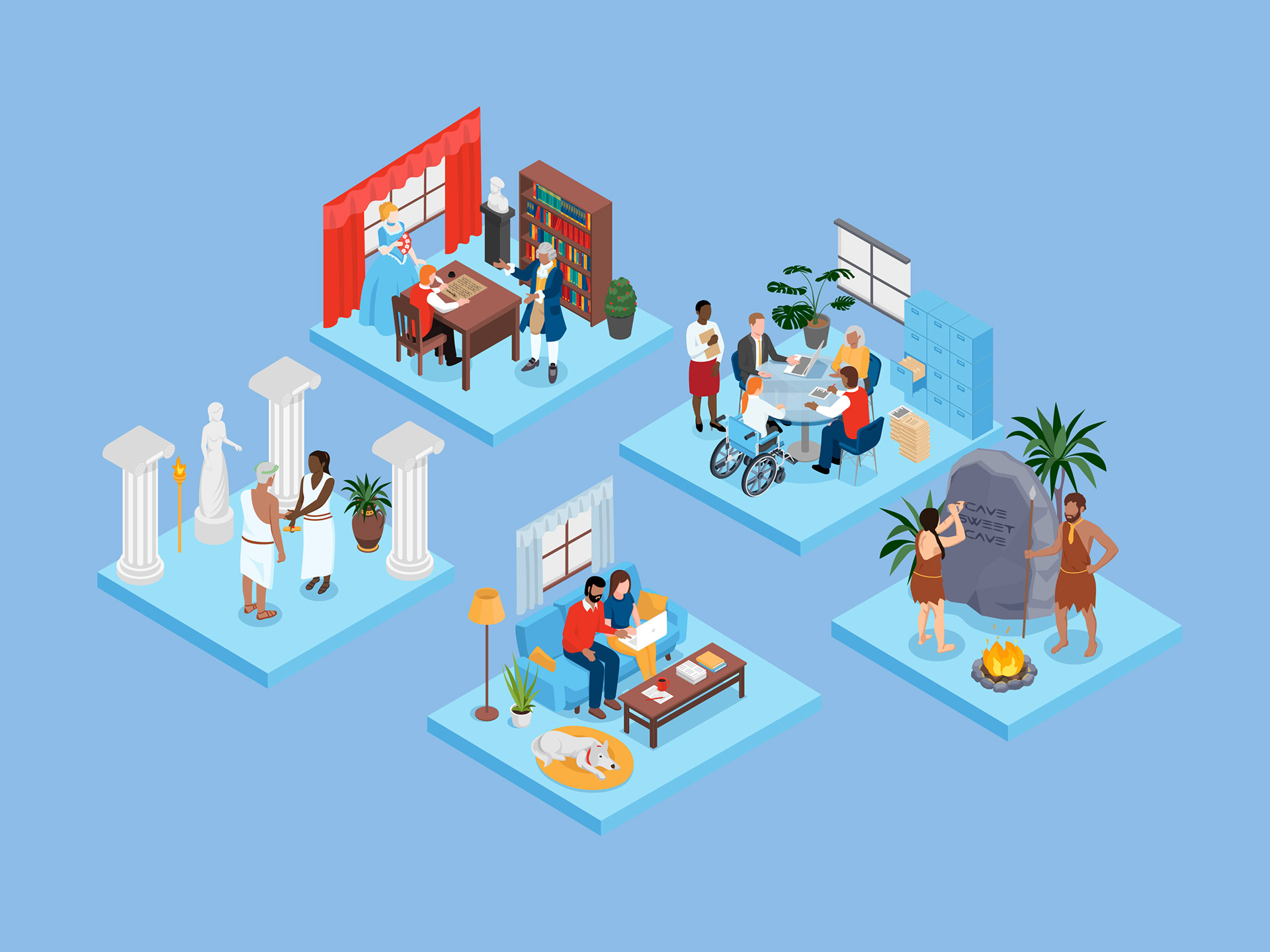 I created these illustrations as part of First American Title's new Remote Online Notarization rollout campaign. The concept we wanted to communicate was about how closing on a home has changed throughout time, and where it will be going in the future.